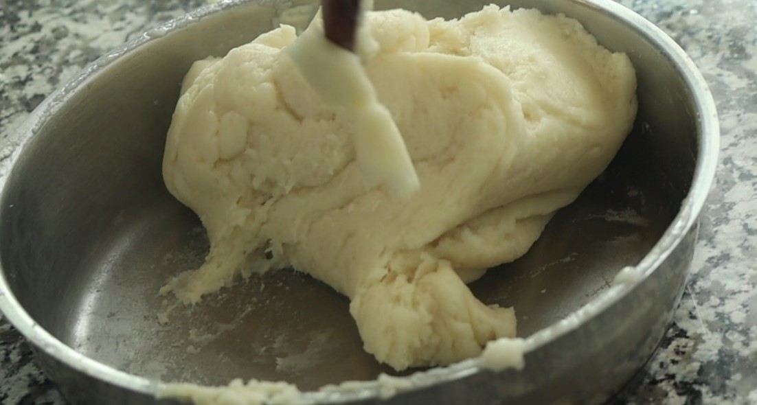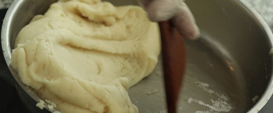 - خمیر را به پاتیل (یا روی میز) انتقال میدهیم با سرعت آرام و با سری پنجه کار کند تا خمیر خنک شود تا بتوان به آن تخم مرغ اضافه کرد.