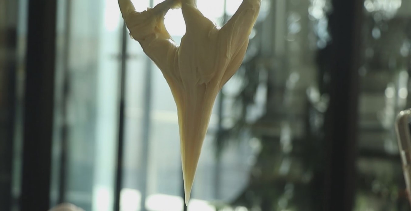 - در این خمیر پس از ترکیب 6 عدد تخم مرغ ، به بافت زیر رسیدیم و دیگر احتیاجی به اضافه کردن تخم مرغ نیست .