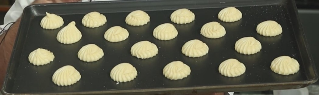 - پس از آماده شدن ، میتوانیم با ماسوره آچاری یا گرد خمیر ها را روی سینی تفلون پایپ کنیم .
