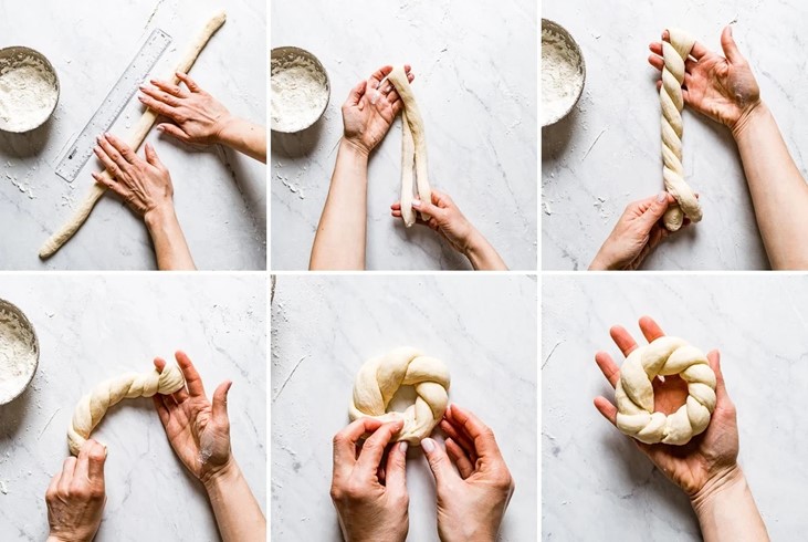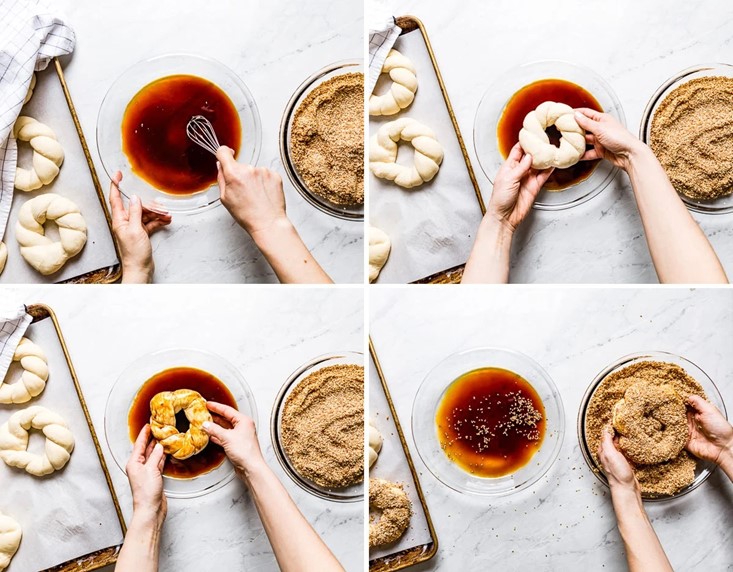 - حدود 20 سانتی متر رشته های 2 تایی را دور هم پیچیده و دایره درست میکنیم و در شیر انگور سپس در کنجد می غلتانیم.
