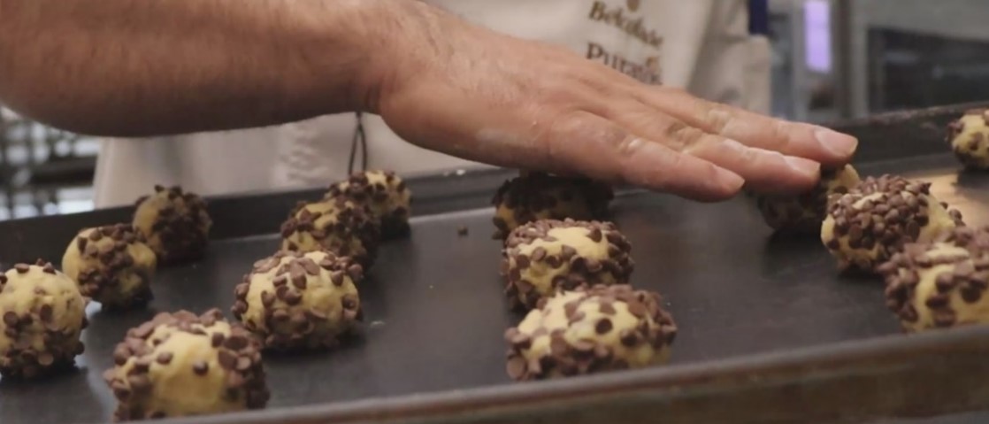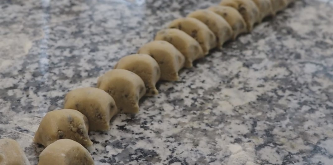 • خمیر کوکی را روی میز آردی رول کنید و به قطعات مساوی 30 الی 35 گرم تقسیم کنید و گرد کنید