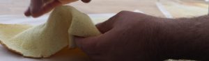 • اندازه سینی 40 در 60 ، خمیر را به ضخامت 5 میل روی کاغذ پهن میکنید (بیشتر از 5 میل ممکن است محصول تَرَک بردارد) و به سینی 40 در 60 انتقال میدهید .